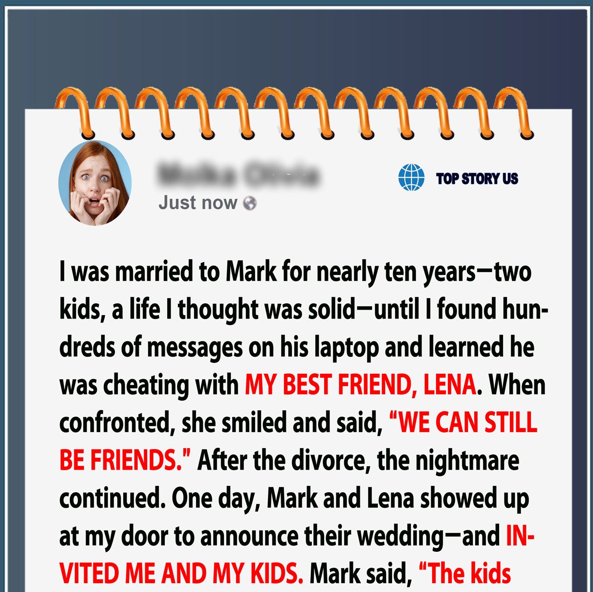 It was a collage of photos: Mark and me, arm in arm with Lena, smiling at the park. Lena laughing at my kitchen table, her hand on Mark’s shoulder. One of her decorating our Christmas tree, standing just behind the kids. And at the center, our wedding photo — Mark and I, young, naïve, and very much in love.