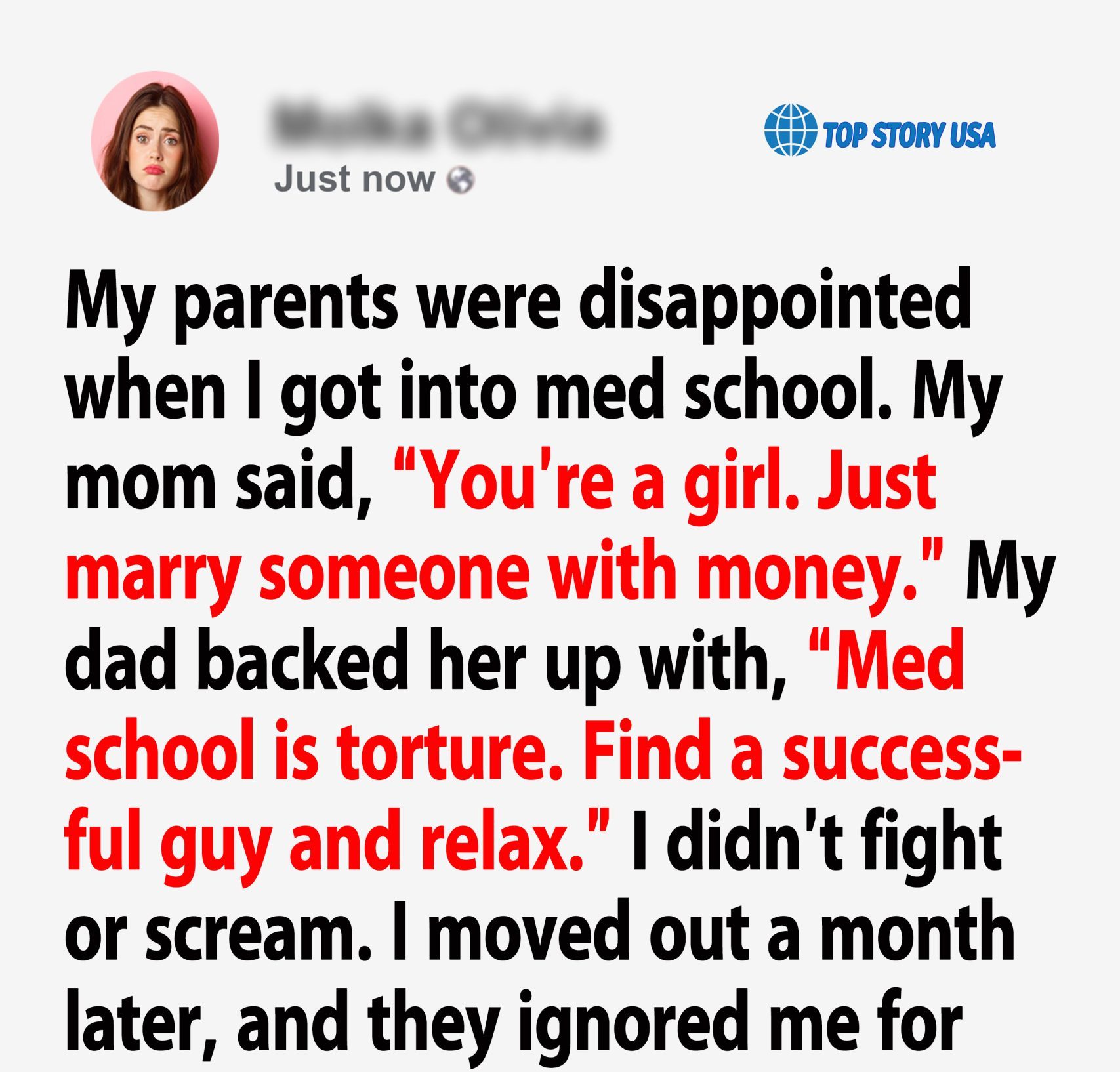My dad nodded. “Med school is torture. Why struggle like that? Find a successful guy and relax.”