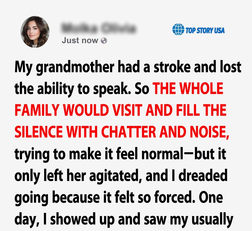 We visited constantly. Aunts, uncles, cousins—everyone rotating in and out of her small living room as if presence alone might fix something. People talked nonstop. They filled the air with updates about neighbors, work gossip, memories she might remember if we repeated them enough times. Someone always turned the TV on, loud, like background noise could stand in for conversation. Someone else scrolled through photos on their phone and held them up, narrating every image.