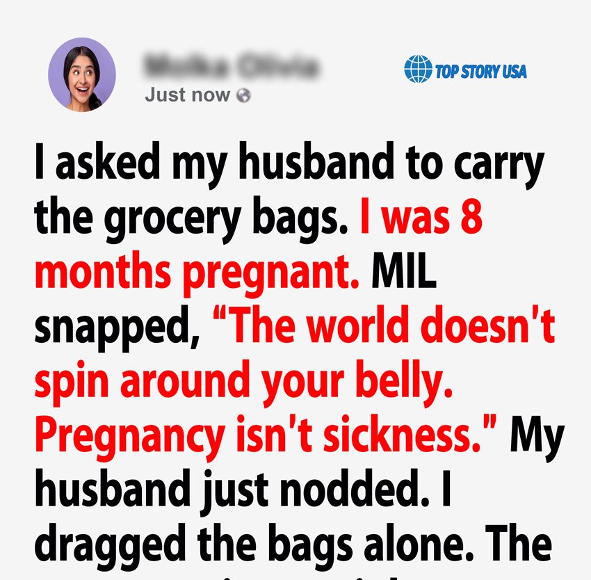 Her words stung. I stood there, stunned, waiting for my husband to defend me, to say something—anything—that would acknowledge the effort I was making. But he only nodded, as if her cruelty were truth carved in stone. And so, with my swollen belly and trembling arms, I dragged the bags inside alone. Each step felt heavier than the last, not because of the groceries, but because of the silence that followed. My husband’s silence. His mother’s scorn. My own loneliness.
