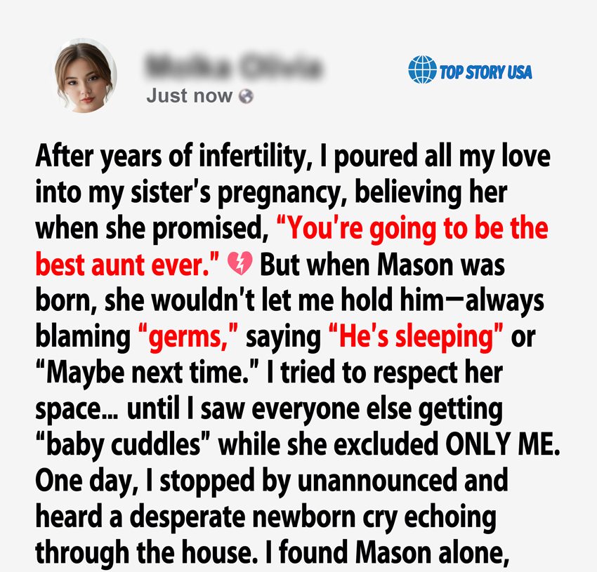 Then I accidentally saw a photo online—our cousin on my sister’s couch, smiling, cradling Mason.