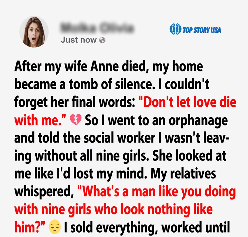 On the night the last daughter moved out, Richard sat alone holding a framed photo of the nine as toddlers, lined up like pearls on a string. He whispered, “I kept my promise, Anne.”