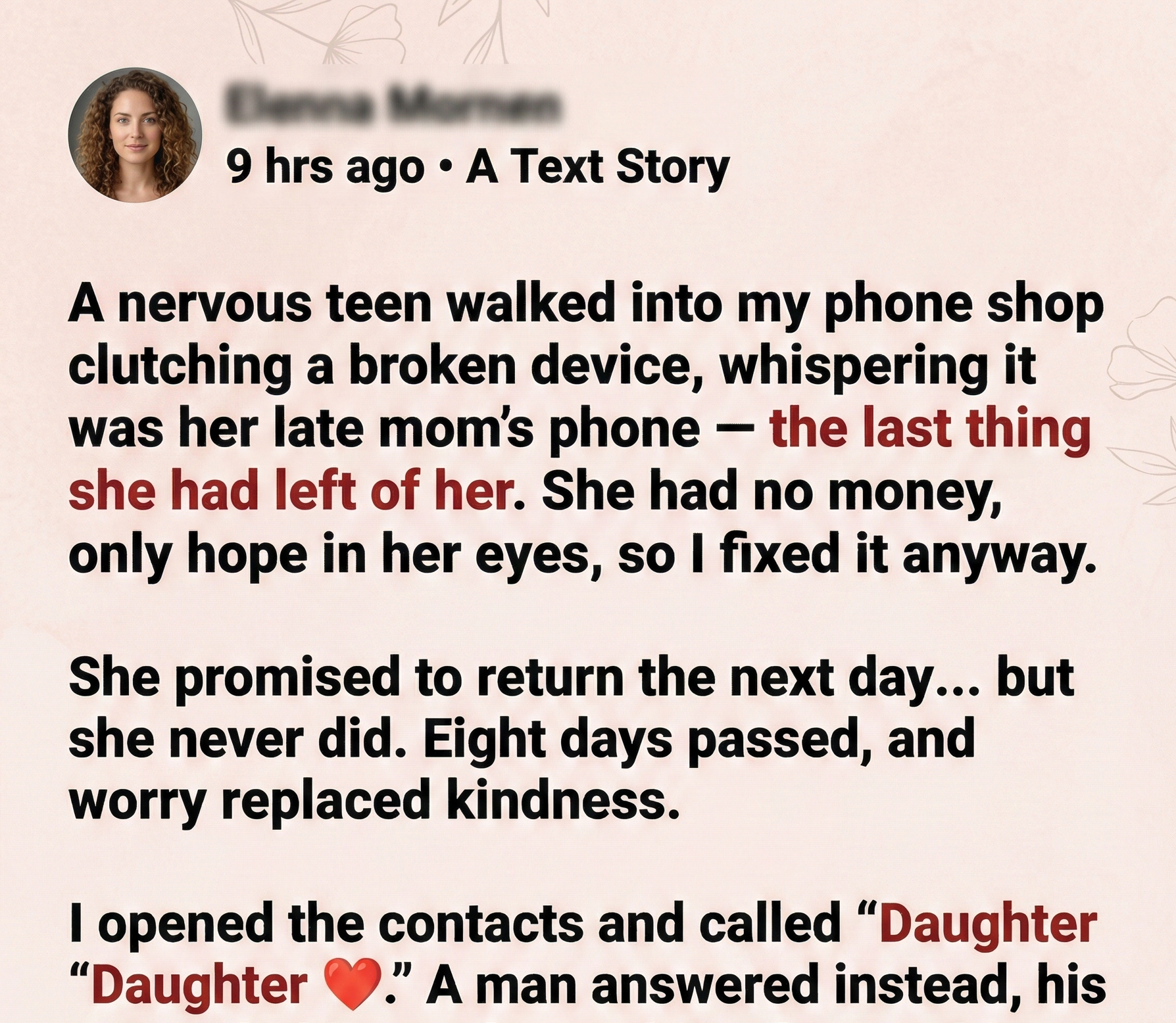 Her hoodie sleeves were pulled down over her hands, and her eyes kept scanning the floor instead of meeting mine. I’ve owned that little shop for twelve years. I’ve seen cracked screens, water-damaged tablets, phones run over by cars. I’ve seen adults yell over lost photos and teenagers panic over broken Snapchat streaks.