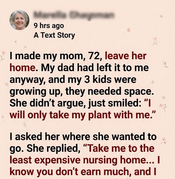 The day she left, she walked out slowly, carrying nothing but a small, worn bag and that green potted plant she’d watered every morning for years. I didn’t help her to the car. I told myself she was strong enough. I told myself I’d visit soon.