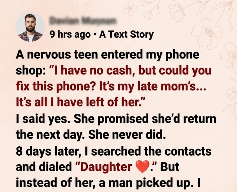 Her hoodie sleeves were pulled down over her hands, and her eyes kept scanning the floor instead of meeting mine. I’ve owned that little shop for twelve years. I’ve seen cracked screens, water-damaged tablets, phones run over by cars. I’ve seen adults yell over lost photos and teenagers panic over broken Snapchat streaks.