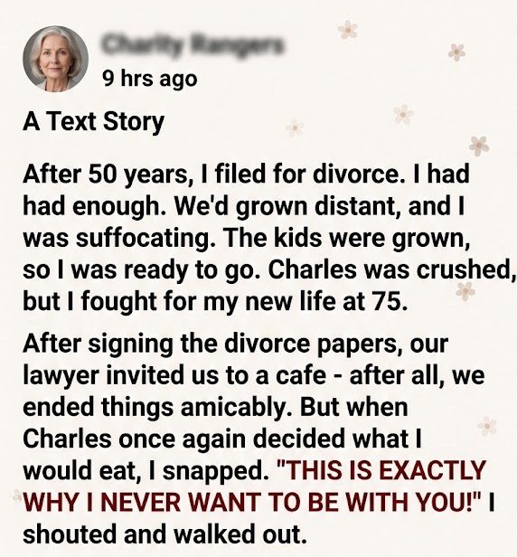 And now, at seventy-seven, I live alone in a small apartment filled with sunlight and color I chose myself. I order spicy food. I take art classes. I wake up every morning knowing my life is finally my own.