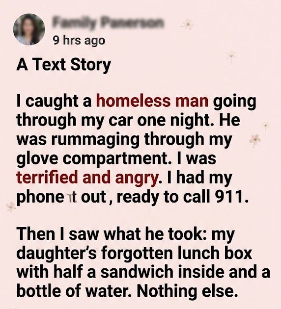 He looked down at it like it might burn him. “Just this,” he said, opening it with clumsy fingers. Inside was half a peanut butter sandwich wrapped in wax paper and a bottle of water. He didn’t touch anything else. Not the change in the cup holder. Not the charging cable. Nothing.