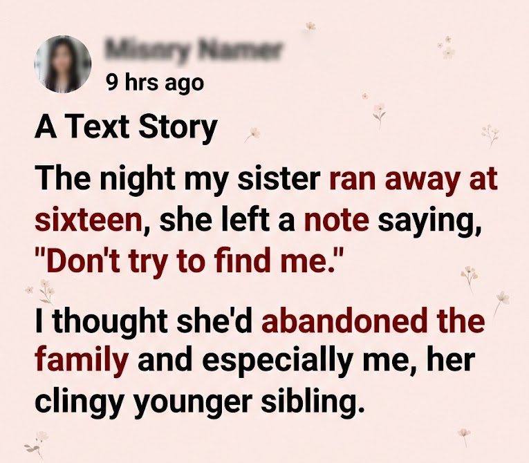 We didn’t see her again for a long time. Postcards came sometimes. A phone call once a year if we were lucky. Mom defended her weakly. Dad never spoke her name. And I grew up with a hole where my sister should have been, telling myself I didn’t need her.