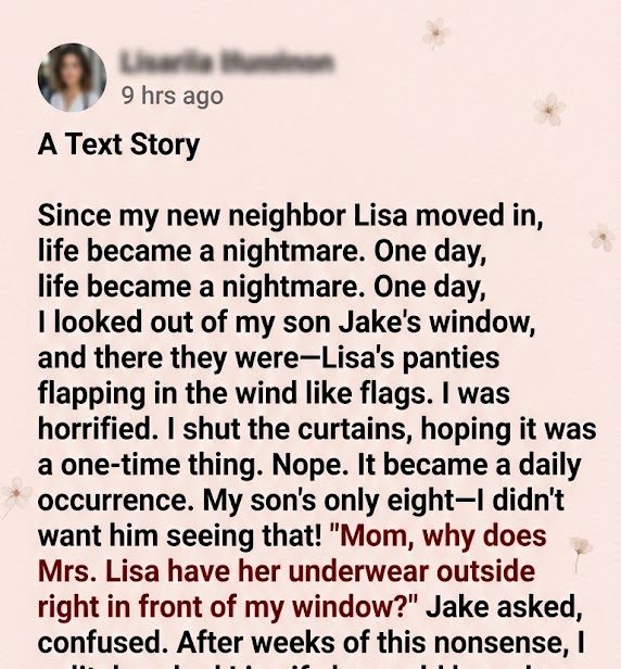 “Hey, Lisa,” I said politely. “I just wanted to ask if you could hang your laundry a little further down the yard. It’s right in front of my son’s window, and he’s only eight.”