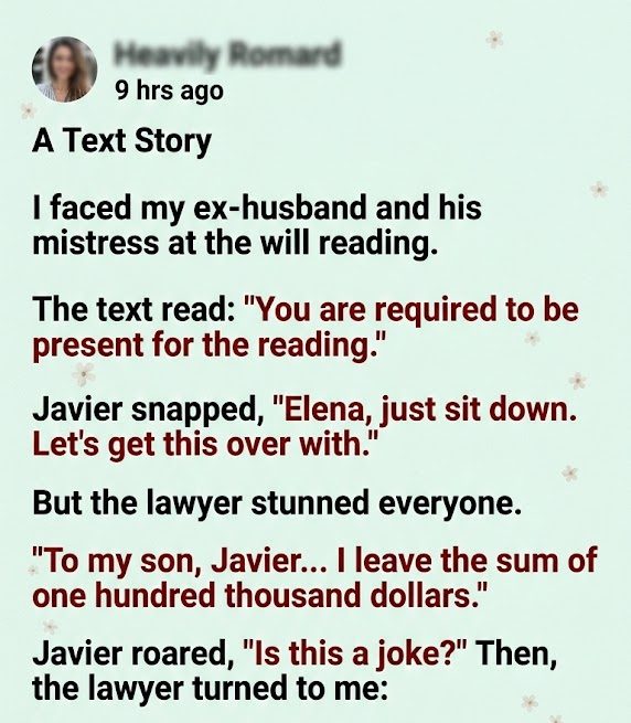 The heavy oak door of the notary’s office felt like a barrier between two worlds, separating the quiet sanity of the hallway from the suffocating toxicity waiting inside, yet I walked through it knowing that my ex-husband, his mistress, and his mother would be waiting like vultures circling a carcass. I showed up anyway, not because I wanted to see the faces that had haunted my nightmares for the past year, nor because I missed the life I had violently lost, but because the message on my phone had made my stomach drop with a command I couldn’t ignore: “You are required to be present for the reading.” When I finally stepped into the room, the air was thick with the scent of expensive leather and old paper, a smell that usually comforted me but today made me nauseous. I didn’t sit down in the empty chair they had left for me; instead, I stayed standing near the bookshelf with my arms crossed tight against my chest, as if keeping my body rigid enough would prevent my heart from betraying the anxiety thundering against my ribs. The lawyer, Gavin Herrera, looked up from his desk, adjusted his wire-rimmed glasses, and spoke with a professional calm that contrasted sharply with the tension in the room, looking directly at me to say, “Mrs. Valenzuela… I’m glad you decided to join us.”