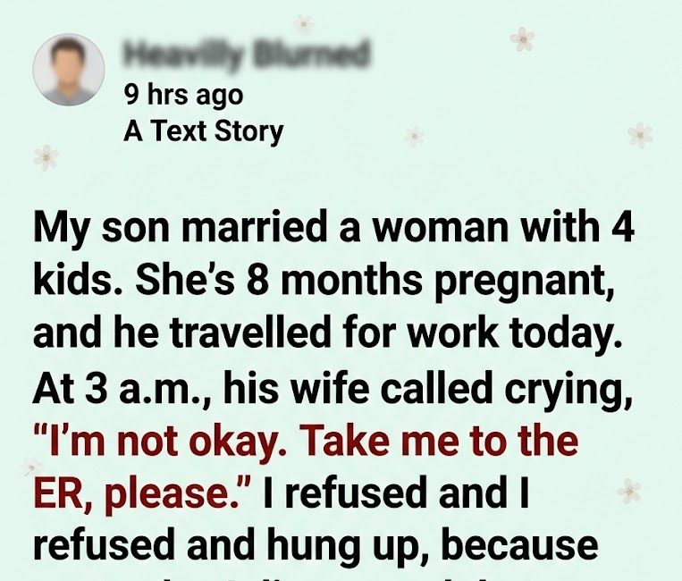 “I tried,” she whimpered, “My phone… it’s almost dead. And my husband… your son… he’s on his way home from his trip, he’s hours away. I just need someone to take me. Please. You’re the closest.”