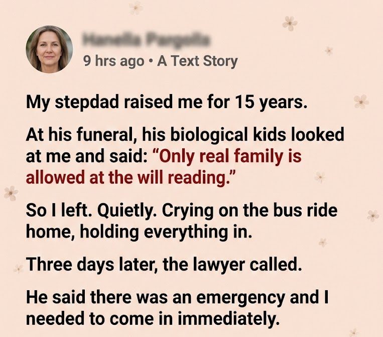Three days later, my phone rang. The number was unfamiliar, and for a moment I considered ignoring it. When I answered, a man introduced himself as the lawyer handling my stepdad’s estate. His voice sounded uneasy, like he was stepping carefully through something fragile.
