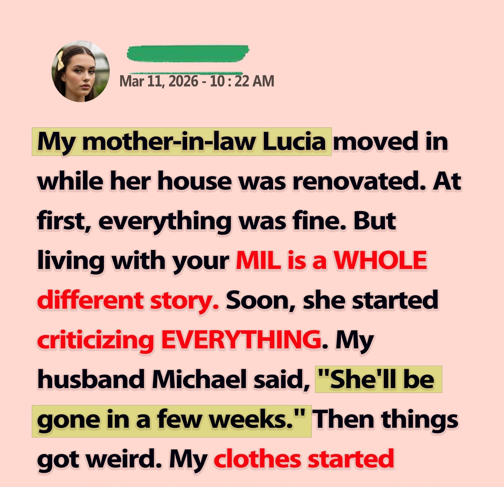 A few months ago, my mother-in-law, Lucia, moved in with us while her house was being renovated. At first, everything was fine — we had always gotten along reasonably well. But living with your MIL is a WHOLE different story.