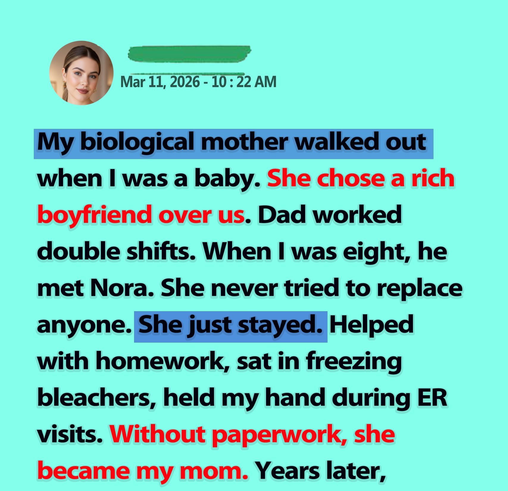 She helped me with homework, stayed in freezing bleachers at my games, and held my hand during my first ER visit when I broke my wrist. She celebrated my achievements, comforted me during failures, and gradually became a constant in my life.