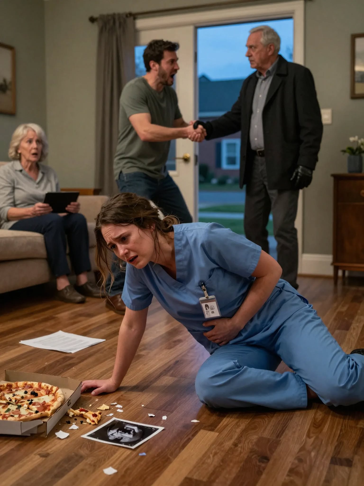 I walked in wearing hospital scrubs—still bleeding, still numb—after losing our baby in the ER. My husband didn’t ask if I was alive. He slapped me and screamed that he and his mother were “starving.” When I whispered, “I miscarried,” he called me a liar and raised his fist again. That’s when the front door shadow moved… and my father finally stepped inside. They had no idea who he really was.