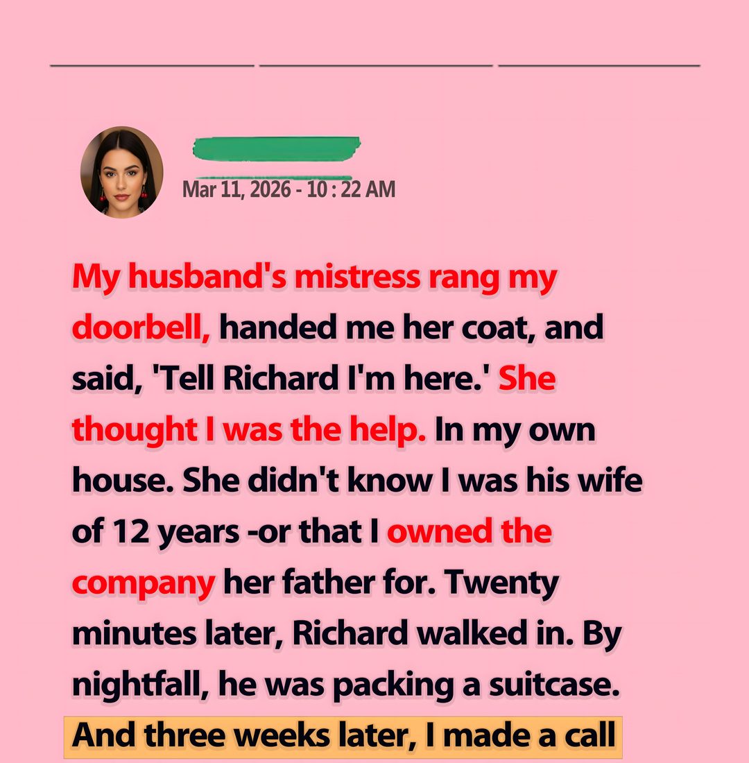 My husband’s mistress rang my doorbell, handed me her coat, and said, ‘Tell Richard I’m here.’ She thought I was the help. In my own house. She didn’t know I was his wife of 12 years — or that I owned the company her father worked for. Twenty minutes later, Richard walked in. By nightfall, he was packing a suitcase. And three weeks later, I made a call that would cost him everything…