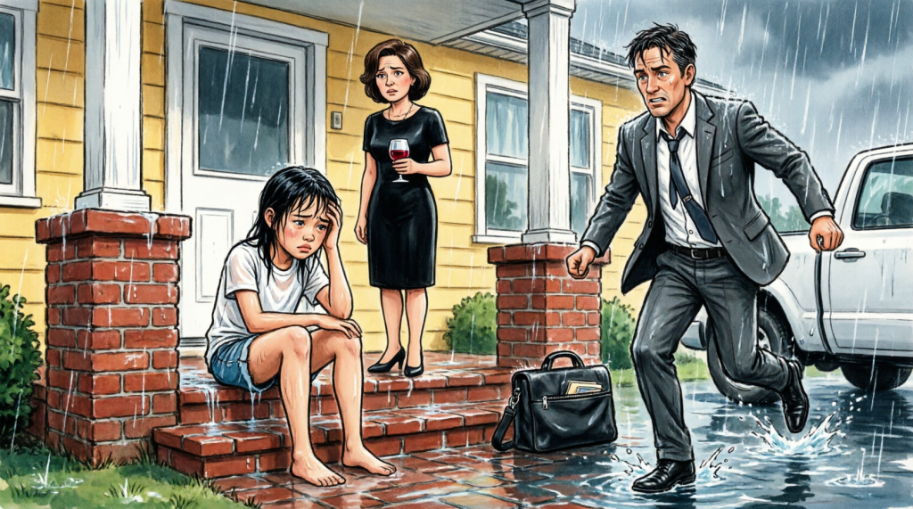 She hauled me to the front door, ripped it open, and the cold rain slammed into my face like punishment from the sky. The porch light flickered. The wind cut through my t-shirt.