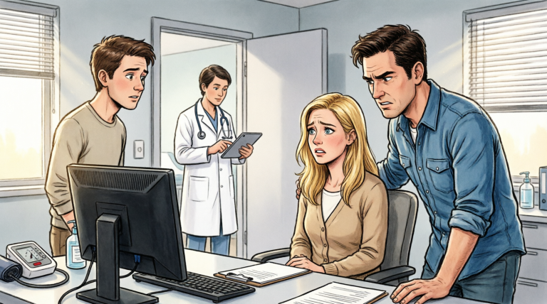 The exam room was too bright. Fluorescent lights that made skin look pale and tired. A paper-covered table crinkled when Nora sat, and she flinched like it was a surprise. I took the chair closest to her. Caleb stayed standing, leaning on the counter near the sink, eyes on the wall chart like he was studying it.