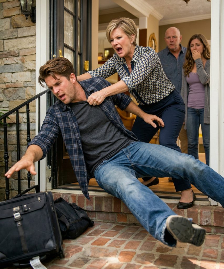 She stormed toward me, grabbed my arm, and shoved me toward the staircase leading to the front door.
