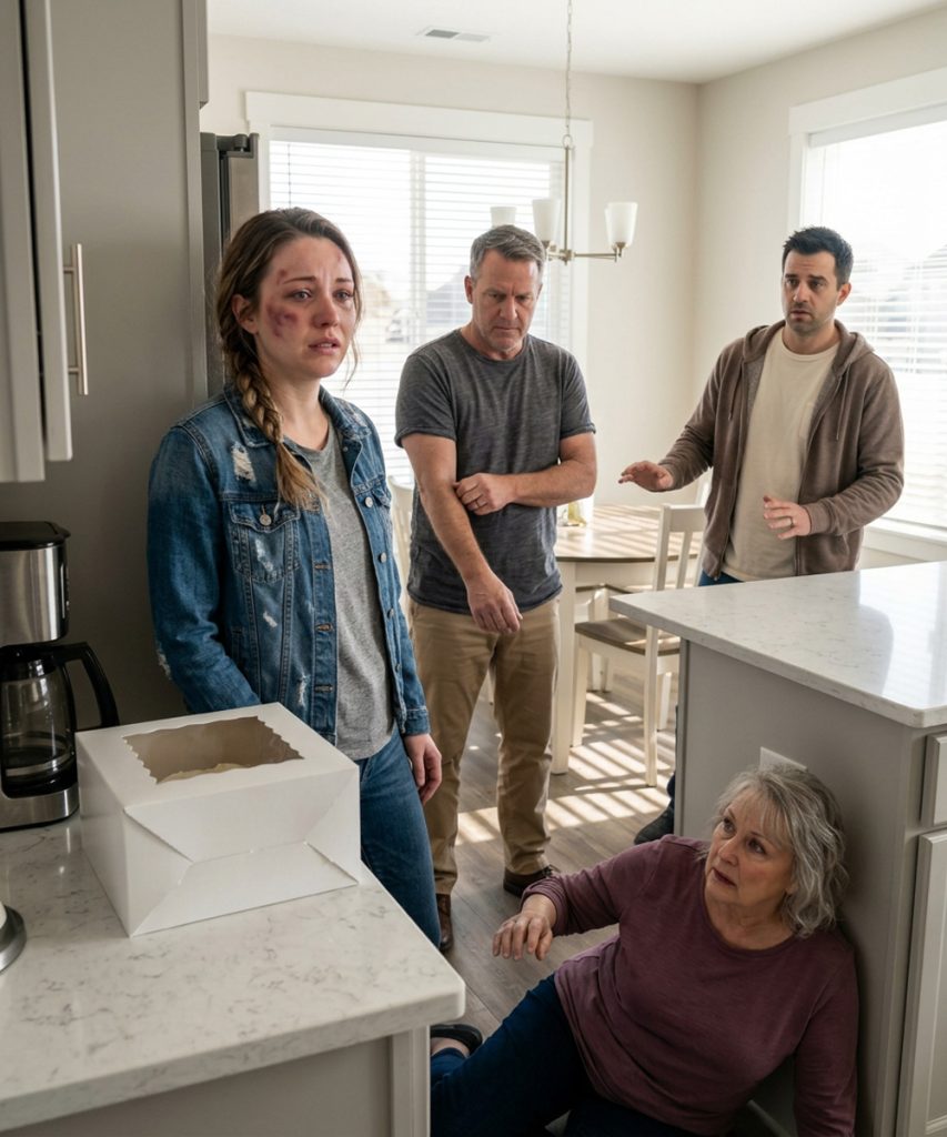 My father, Richard Bennett, had only just crossed the threshold when the cheerful expression he carried disappeared. He had come in holding a neat white bakery box with my favorite strawberry shortcake, planning to celebrate my thirty-second birthday. Instead, he saw me standing in the kitchen, layers of concealer unable to fully mask the dark purple bruising along my cheekbone and jaw.