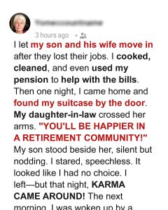 When Hannah’s son and daughter-in-law lost everything, she signed her home into his name to help him get back on his feet. But days later, her suitcase was at the door and she was told to leave. Heartbroken and blindsided, she made one call and karma did the rest.