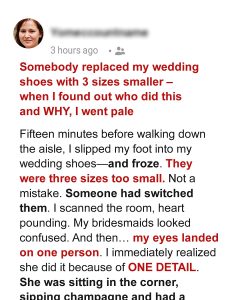 Moments before walking down the aisle, I discovered my wedding shoes had been swapped for a pair three sizes too small. When I locked eyes with the culprit and learned the shocking reason behind it, my stomach dropped.