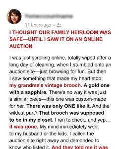 I was scrolling online one night, exhausted after a long day of cleaning and chores, when something on an auction site nearly made me drop my phone. There it was — my grandmother’s vintage brooch. A delicate gold piece set with a sapphire, one-of-a-kind. It wasn’t just jewelry; it was our family’s heirloom, something my grandma wore on every special occasion. She had passed it down to me, and I kept it safely tucked away in my closet.