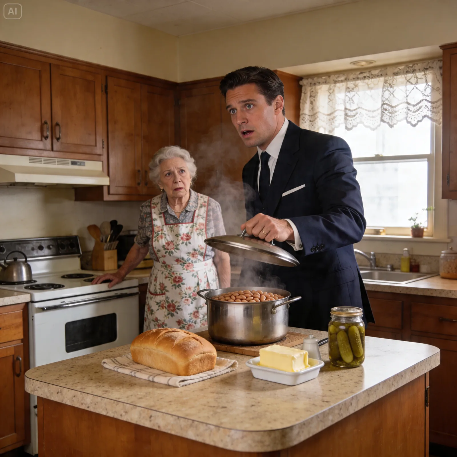 You stand very still by the stove, one hand braced against the counter because the room has started to tilt slightly around the edges. The steam from the beans curls upward between the three of you like something alive, something witnessing. You think of all the months behind you: cutting pills in half, sleeping in socks and a sweater because you couldn’t run the heater all night, pretending the canned crackers from the parish were enough, telling yourself your son was busy but good.