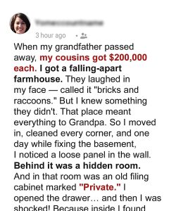 One afternoon, while cleaning the basement, I spotted a wooden panel that didn’t match the rest. It was newer, different nails. I pried it open and discovered a hidden room. Inside were fabric bolts, vintage machinery, ledgers filled with Grandpa’s handwriting—and one locked filing cabinet marked “Private.” With a bobby pin, some YouTube tutorials, and a lot of patience, I opened it.
