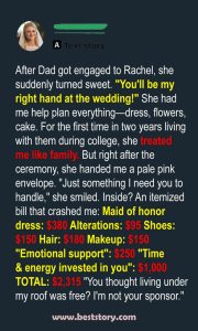 When my stepmom made me her maid of honor, I thought we were finally becoming a real family. But moments after her vows, she handed me an itemized bill… charging me for everything. I froze, my eyes stinging with disbelief. But she didn’t realize that my dad was standing right behind her.