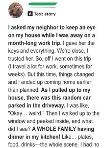 I left for a month-long work trip, trusting my neighbor and friend to watch my house. But when I returned early, I found a strange car in the driveway… and a family of strangers eating dinner in my kitchen!