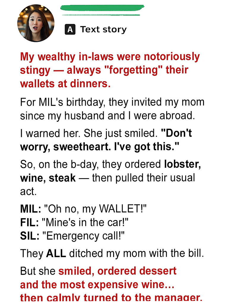 For years, my wealthy in-laws pulled the same trick: “forgetting” their wallets at dinner to avoid paying. When they invited my mom to a fancy restaurant, thinking she’d fall for it too, they had no idea she was ready. This time, their scam backfired… spectacularly.