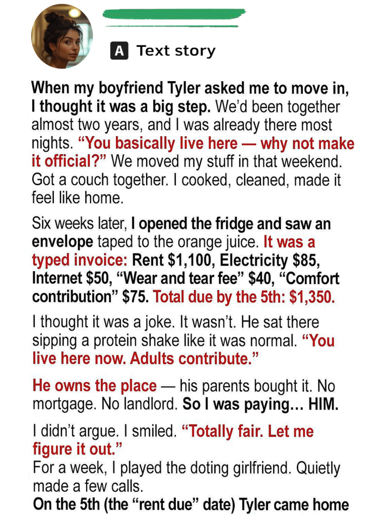 When Tyler asked me to move in, I thought it meant we were building a life together. Six weeks later, I opened the fridge and found an invoice for rent, utilities, and even a “comfort fee.” He owns the place outright. So, what exactly was I contributing to?