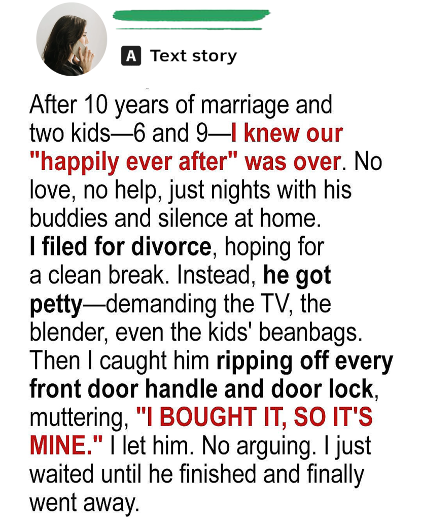 They say the true colors of a person show when a relationship falls apart. Mine glowed neon when my husband of ten years took the door handles after our divorce because he “paid for them.” I stayed silent and let karma do its thing. Sure enough, my ex called me almost in tears three days later.