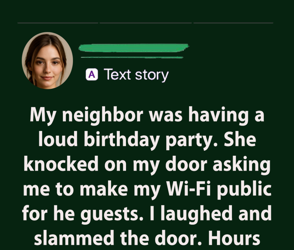 My new neighbor threw a big birthday party for herself and invited over 50 people. I didn’t mind the noise too much, but then she knocked on my door asking to make my wi-fi public for her guests. I just laughed and slammed the door in her face. If she’s rich enough to host 50 guests, she can afford to set up a public wi-fi for them.