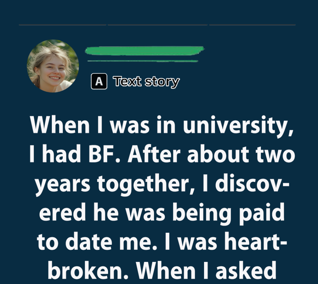 - When I was in university, I had a boyfriend. After about two years together, I discovered he was being paid to date me. I was heartbroken.