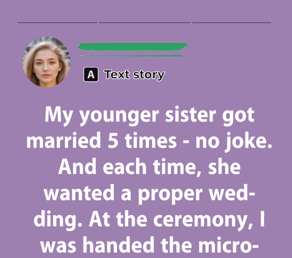 - My younger sister got married 5 times — no joke. And each time, she wanted a proper wedding. At the ceremony, I was handed the microphone to give a toast. I found the same speech I’d given at the previous 4 weddings.