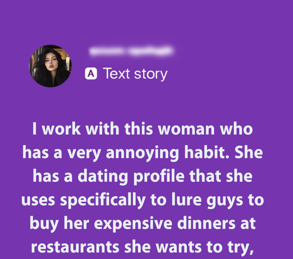 “I (28m) work with this woman Lydia (24f) who has a very annoying habit. She has a dating profile that she uses specifically to lure guys to buy her expensive dinners at restaurants she wants to try, and then ghosts them. Lydia brags about this all the time and is never interested in actually dating, but she’ll act like it to sell it.