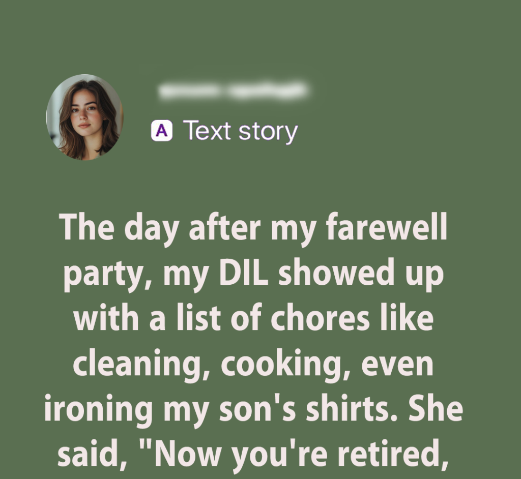 The day after my farewell party at work, when everyone hugged me and told me to enjoy sleeping in, my daughter-in-law showed up at my door. She was smiling, holding a handwritten note. I thought maybe it was a sweet message or even a card. But when I opened it, I realized it was a list of chores. Cooking, cleaning, grocery shopping, and even ironing my son’s shirts. She said brightly, “Now that you’re retired, you can finally help us out and stay useful. It’s about time.”