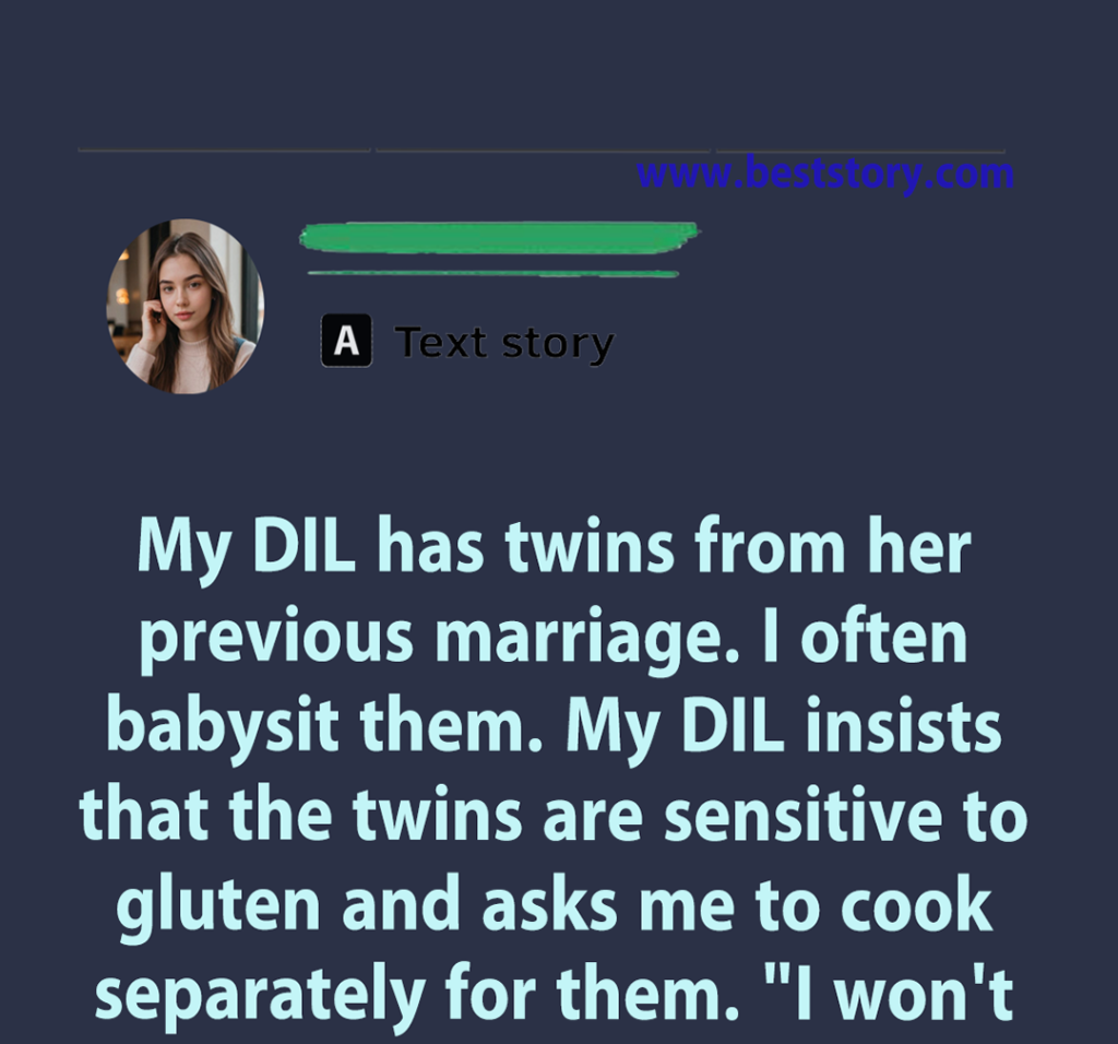 My DIL says the twins are gluten-sensitive and wants me to cook separately. “I won’t spend more than $15 on your kids’ fancy foods,” I remarked. She grinned.