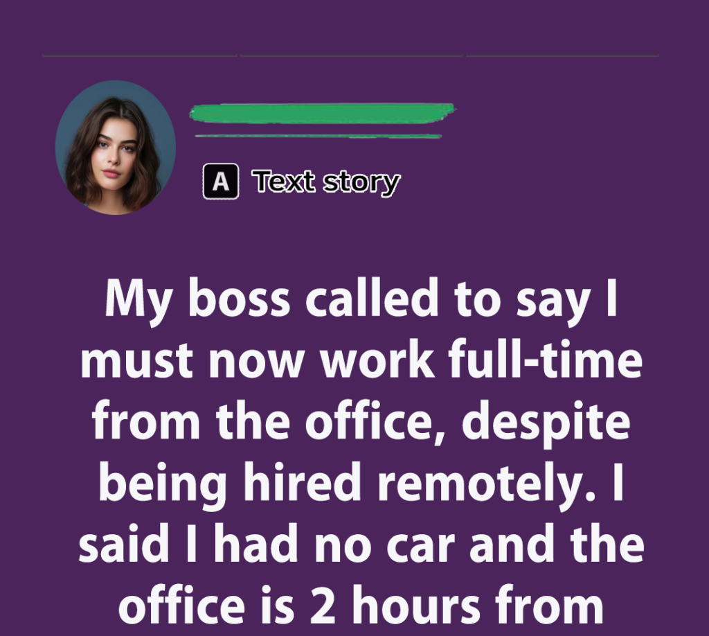 A few days ago, my boss called to say I must now work full-time from the office, despite being hired remotely. I said I had no car and the office is 2 hours from home. His reply: “Your personal commute is not my problem!”