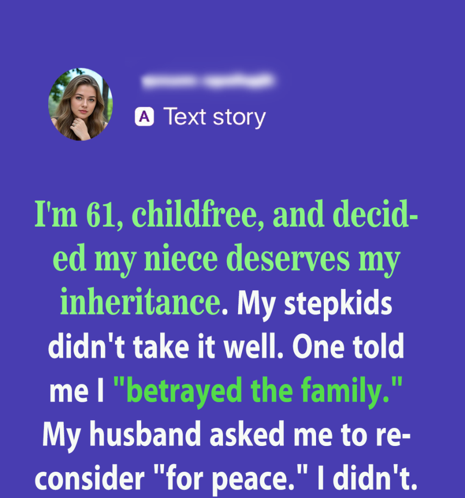 I’m 61, childfree, and decided my niece deserves my inheritance. My stepkids didn’t take it well. One told me I ‘betrayed the family.’ My husband asked me to reconsider ‘for peace.’ I didn’t.