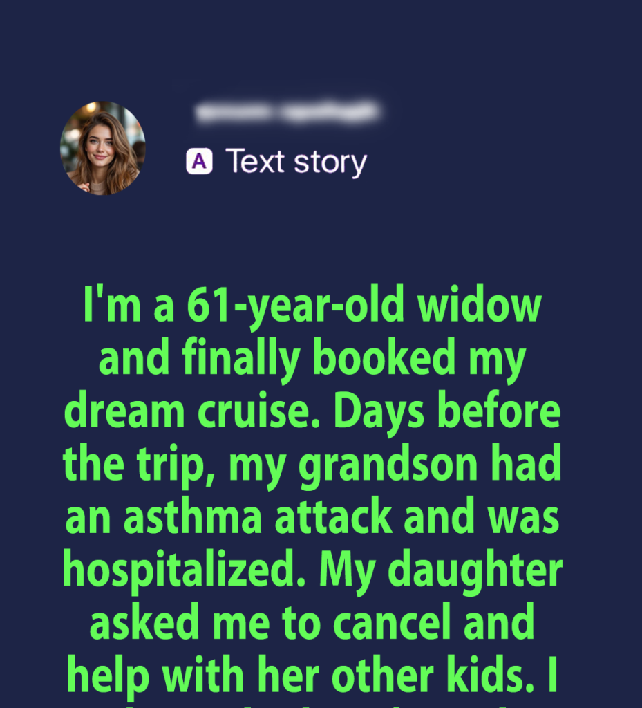 I’m a 61-year-old widow and finally booked my dream cruise. Days before the trip, my grandson had an asthma attack and was hospitalized. My daughter asked me to cancel and help with her other kids.