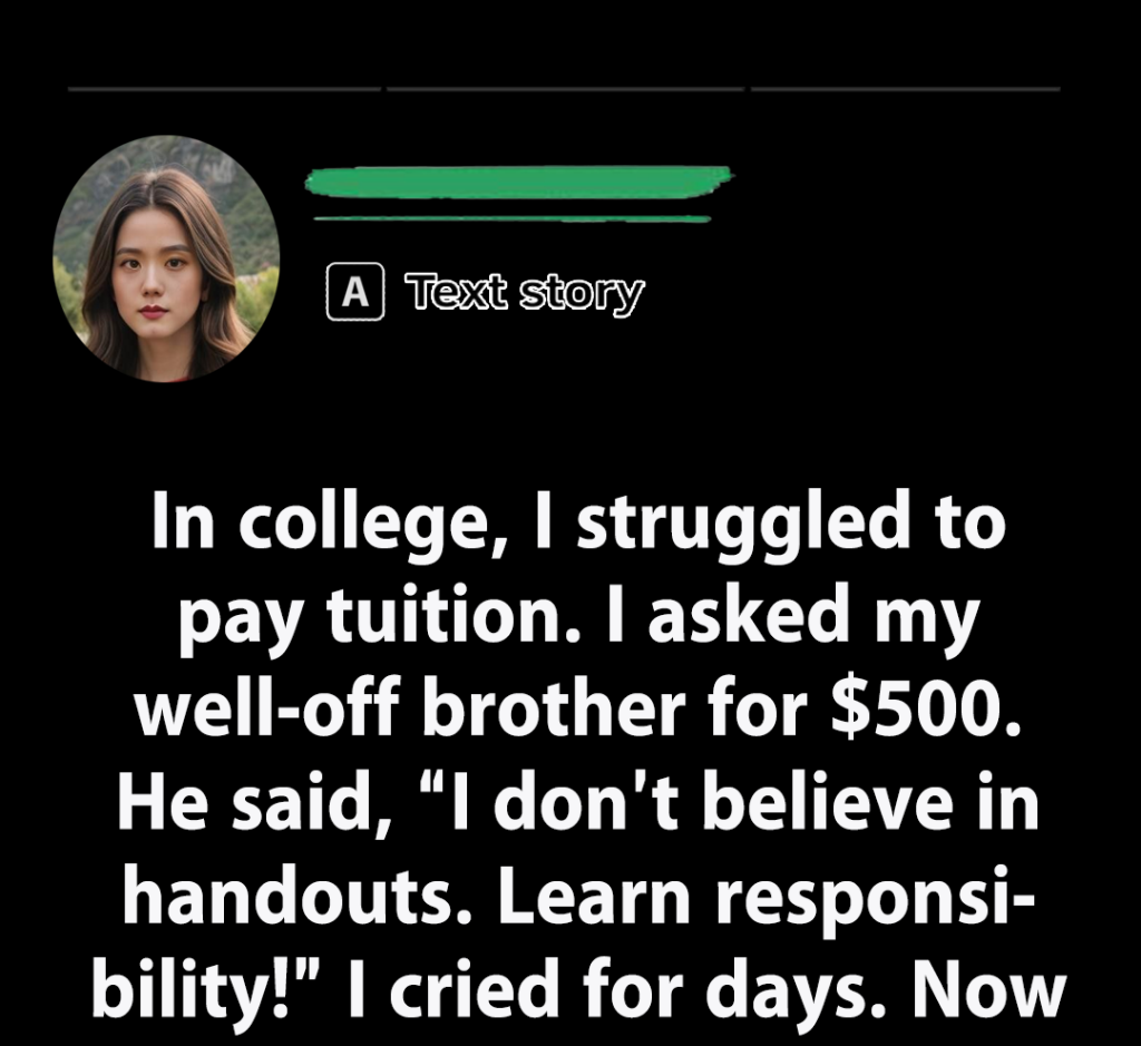 Years ago, when I was in college, I was struggling to pay rent and tuition. I asked my older, well-off brother for a little help—not a huge amount, just 500 dollars to get me through the semester. He had a stable job back then, but he refused. He said he didn’t believe in handouts and that I needed to learn responsibility. I cried that night, but I told myself, “Lesson learned.”