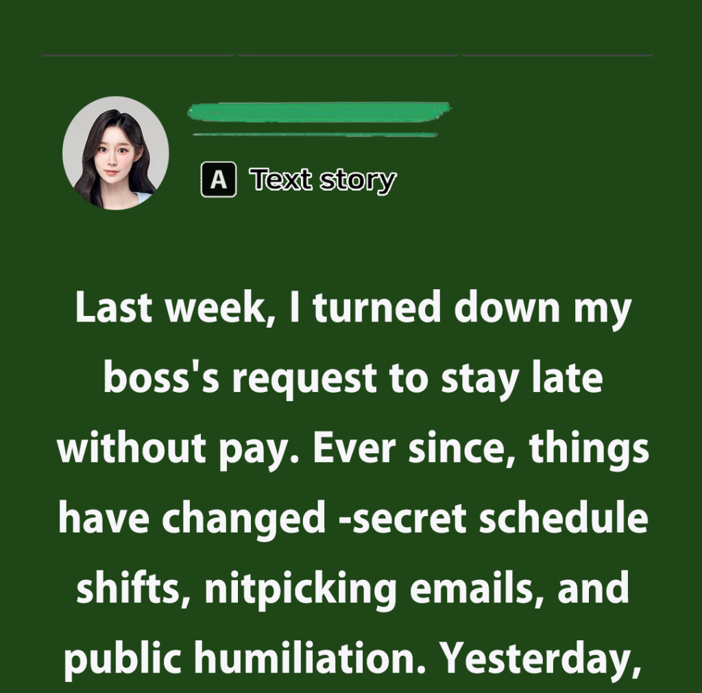 The kicker was yesterday. I walked by his office and overheard him talking to one of my coworkers. Clear as day, he said he was going to “make her regret it.” That was about me. Imagine hearing your boss plotting to make your life harder just because you didn’t stay late for free.