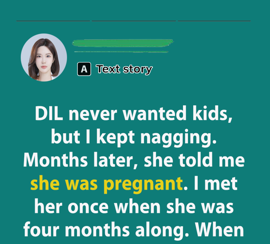 - When my son married, my DIL said she wanted no kids. I thought she was just being selfish so I kept nagging her about giving me grandchildren. I brought it up at every holiday, every phone call, until she finally announced she was pregnant. I saw her once when she was about four months along and felt proud I had convinced her. When the baby was born, she said “No visits allowed”. But I couldn’t wait so I showed up anyway.