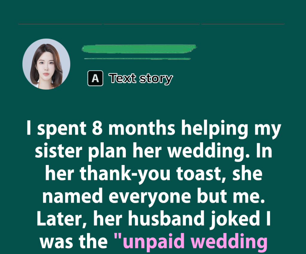 At the reception, in her thank-you toast, she mentioned everyone but me. She named her husband, his parents, their friends — even a cousin who came by once to fold napkins. She didn’t mention me at all.