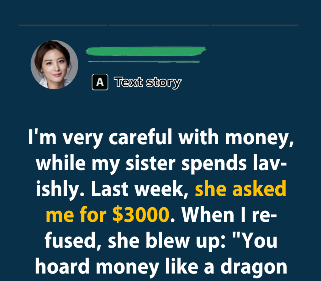 I’m careful with money. My sister, on the other hand, spends lavishly. Last week, she asked me for $3,000. When I refused, she blew up: “You hoard money like a dragon instead of helping family.”