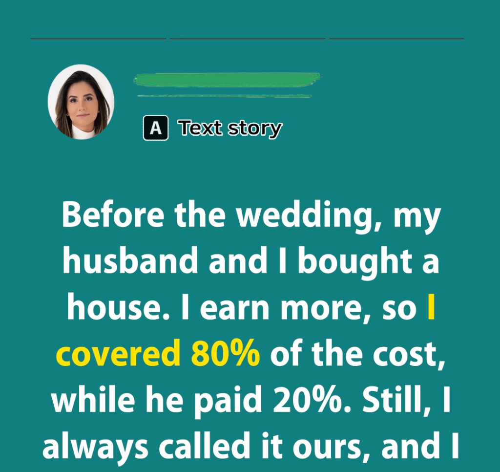 Before the wedding, my now husband and I bought a house. I earn more, so I covered 80% of the cost, while he paid 20%. Still, I always called it ours, and I thought he felt the same.
