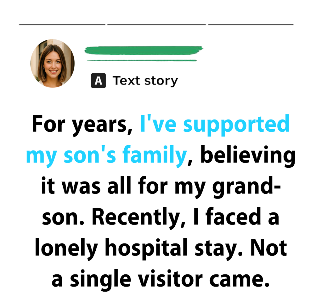 I, (Mary, 68F) have always done what I could for my son and his family, telling myself it was for my grandson. When I spent a few days in the hospital, I thought they would come. Each time footsteps passed in the hallway, I hoped it was them. But the door never opened. Lying there alone, I realized the emptiness hurt more than the illness itself.